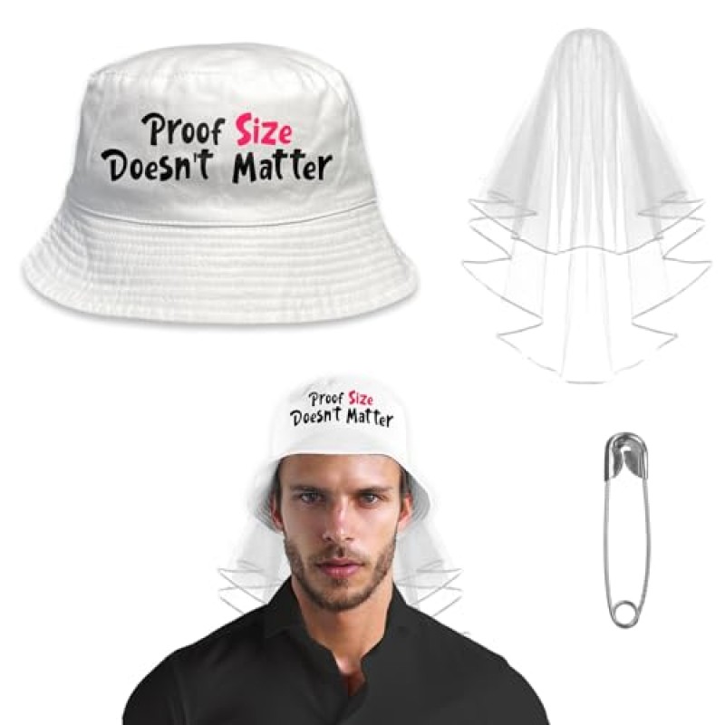 Get the laughs rolling with this cheeky 2-pack stag do outfit featuring a humorous "Proof Size Doesn't Matter" slogan bucket hat and a flowing bridal veil. Perfect for ditching the hassle of co-ordinating accessories, this complete set lets the groom-to-be and his mate rock a playful, put-together look in record time. Made from breathable high-quality fabric, these pieces are comfy enough for the whole party, so no one has to suffer stuffy heads or itchy materials. Just slip on the crisp white hat and veil to instantly become the centre of attention – ideal for sparking giggles and breaking the ice at any stag do shindig. Whether you’re smashing a classic bachelor bash or a more costume-heavy gathering, the versatile white design fits effortlessly into any setting. Plus, the included pins add that finishing touch, keeping everything stylish and secure. It’s a simple, fun way to boost group spirit and guarantee plenty of photo-worthy moments without any fuss.