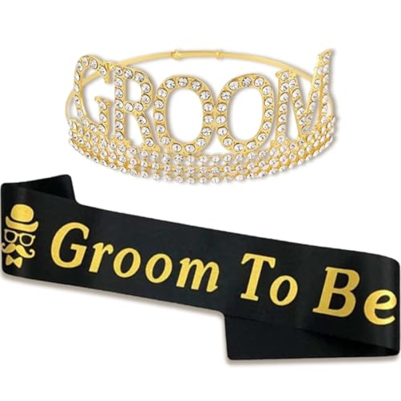 - Includes one crown with simulated diamonds and one groom sash