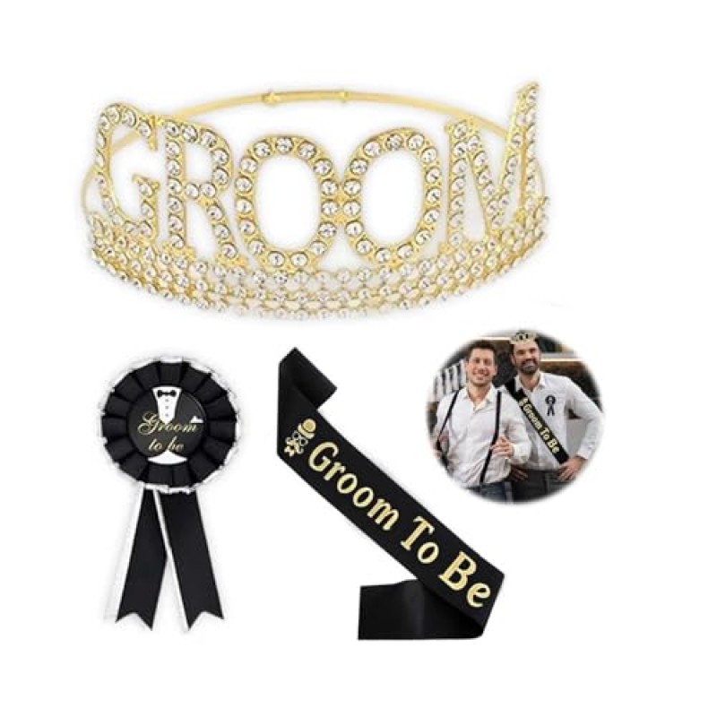 - Includes black satin "Groom To Be" sash and matching metal groom's award brooch