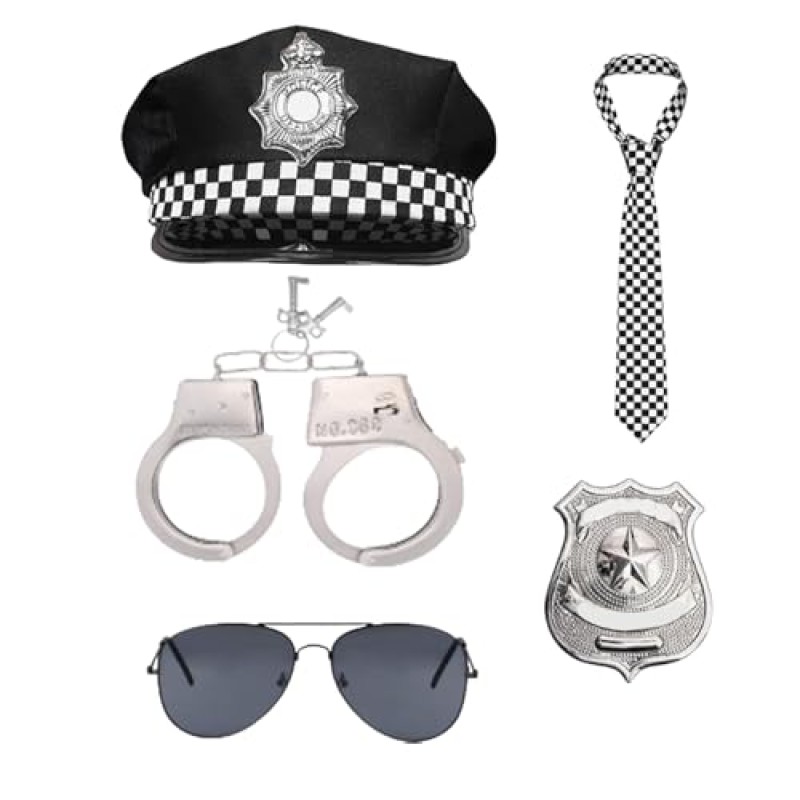 - Includes 1 police hat, 1 pair of metal handcuffs with keys, 1 police badge, 1 checked tie, and 1 pair of black sunglasses
