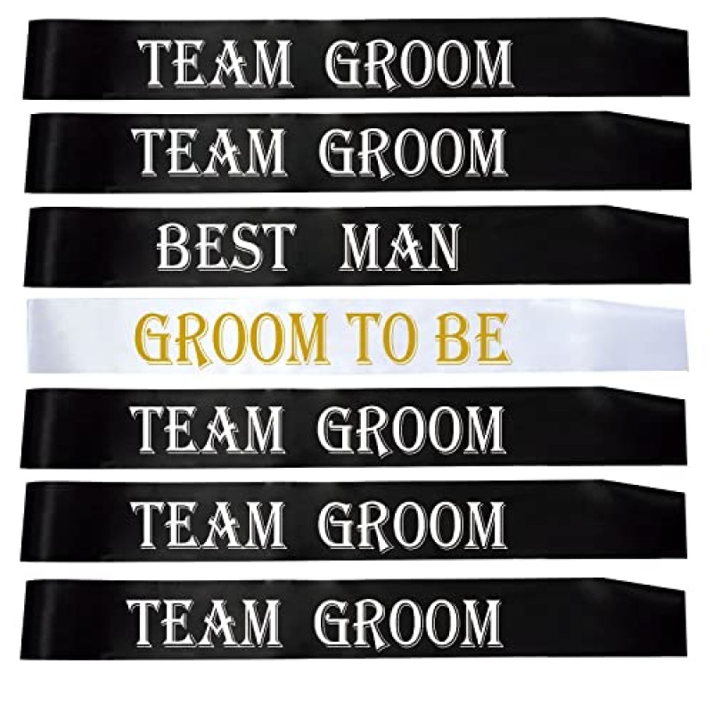 - Includes 7 sashes: 1 ‘Groom To Be’, 1 ‘Best Man’, 5 ‘Team Groom’