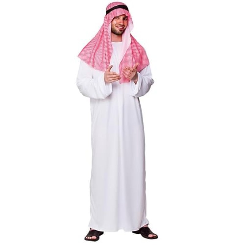 Ready to bring some exotic flair to the stag do? This Arab Sheikh fancy dress costume has you sorted with a classic long white robe and a red checked headpiece, so the groom and his mates can make a striking entrance. Designed for grown men, it fits up to a 48" chest, keeping it comfortable for a night of laughs and good times. Perfect for themed parties, carnival nights, or just to add a bit of cheeky culture to the celebrations, this easy-to-wear outfit delivers quick costume success with no fuss.
