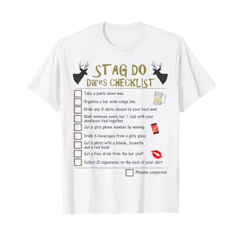 This lively t-shirt transforms the groom into the star of the stag do with nine cheeky dares to complete before the night ends. It’s not just a costume—it’s an interactive checklist that keeps the fun rolling and the group engaged, as everyone cheers on the groom tackling each hilarious challenge. Lightweight and comfy with a classic fit, it’s easy to wear throughout the festivities, helping to track progress with handy tick-boxes right on the shirt. Perfect for turning the groom into the ultimate daredevil and making him feel special while providing countless laughs along the way.