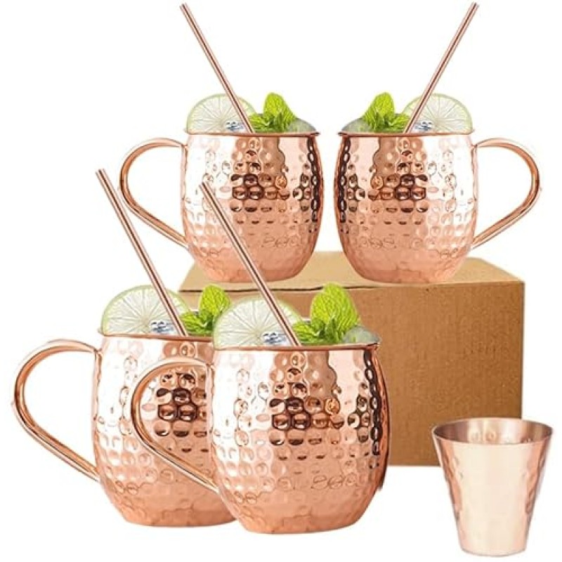 Elevate your stag do drinks game with this set of four handcrafted Moscow Mule mugs, forged from 100% solid copper for that authentic chill and shine. Each hefty mug, weighing over half a pound, promises a sturdy grip and a quality feel that screams celebration. Perfectly sized at 16oz, they hold just enough ice and cocktail to keep the laughs flowing without spills to spoil the fun.