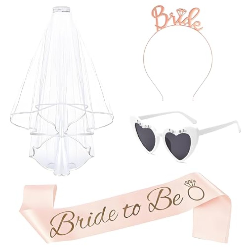 - Includes rose gold satin sash, metal alloy tiara, nylon veil with comb, and plastic heart sunglasses