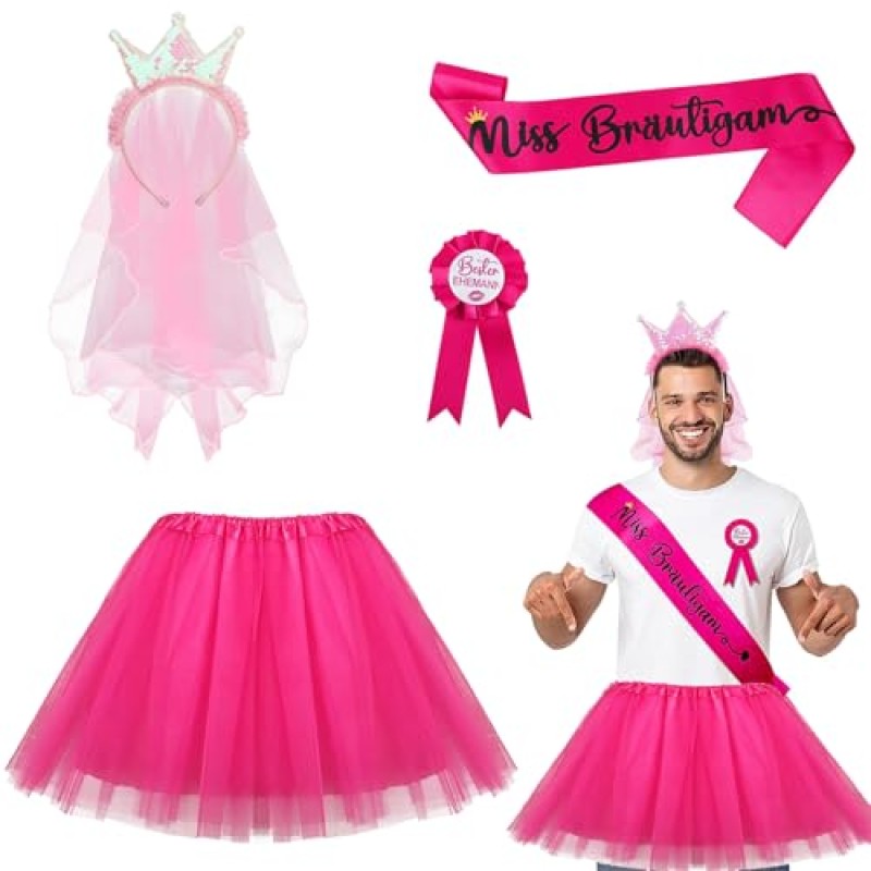 Get the groom ready to steal the show with this cheeky and stylish bachelor party outfit set designed especially for men. This vibrant pink ensemble includes a sash, crown headband, best husband badge, and a playful tulle skirt, promising laughs and memorable moments alike. Perfectly sized to fit most adult men, the elastic waistband on the skirt ensures a comfortable yet eye-catching fit for the groom under 180 cm and 86 kg.