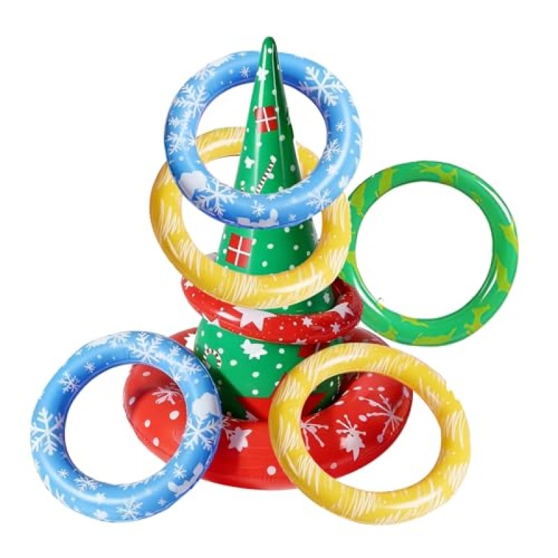- Includes 1 inflatable snowflake hat and 6 soft snowflake rings