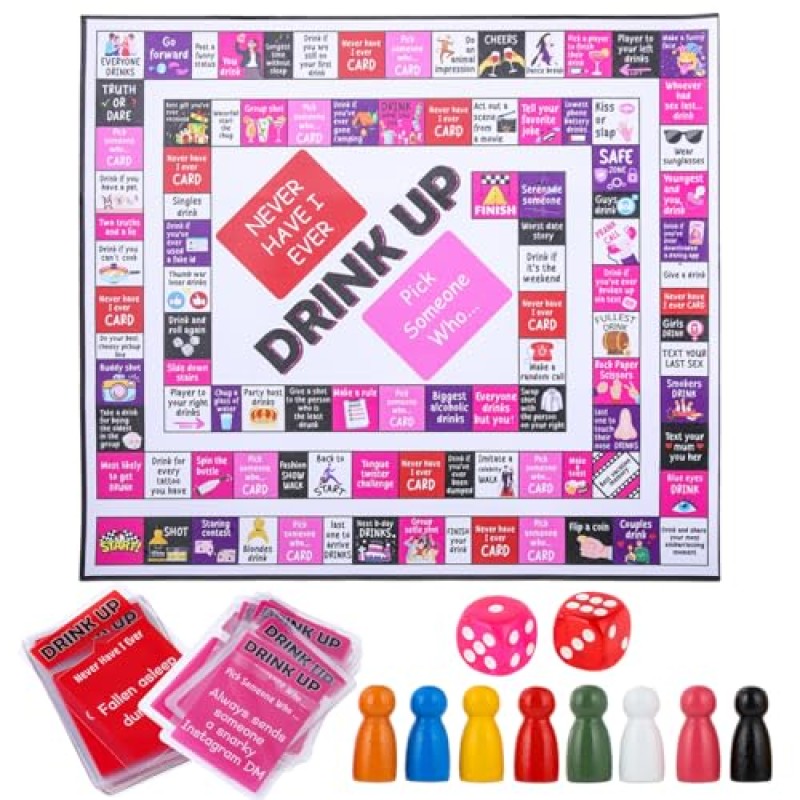 - Includes: 1 waterproof non-slip drinking game mat, 8 player pieces, 2 dice, 42 challenge cards