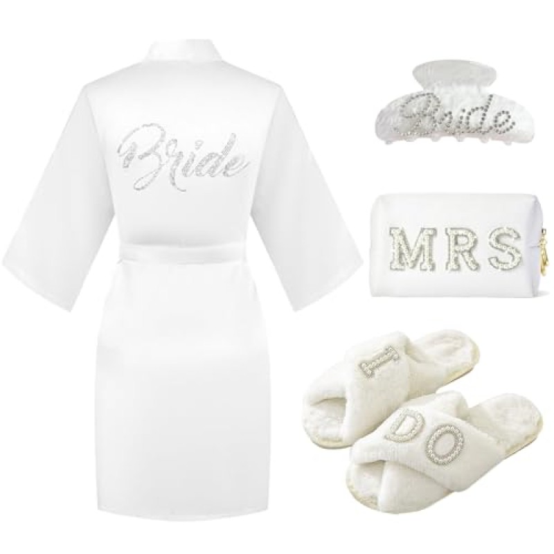 This stunning bride-to-be gift set is a classy collection designed to make any hen do or bridal shower extra special. It includes a white PU leather makeup bag adorned with sparkling rhinestone ‘MRS’ letters and pearls – perfect for stashing wedding day essentials and makeup touch-ups in style. Alongside this, you get a delicate white bridal robe that exudes elegance and comfort, ideal for relaxing with the girls before the big day. The set also features cosy white slippers embroidered with ‘I Do’, complete with rubber soles for practical use, and a charming rhinestone hair clip that adds a subtle sparkle to the bride’s look.