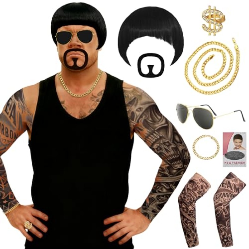 - Complete costume set with wig, sunglasses, goatee, gold chain, ring, and tattoo sleeves