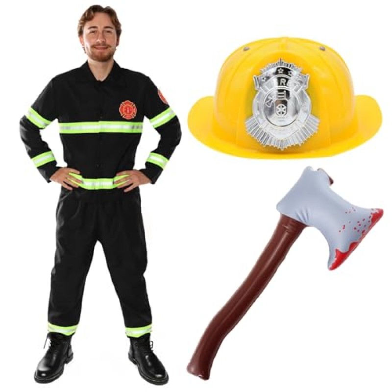 - Includes black top and trousers with reflective strips, yellow fireman hat, inflatable axe