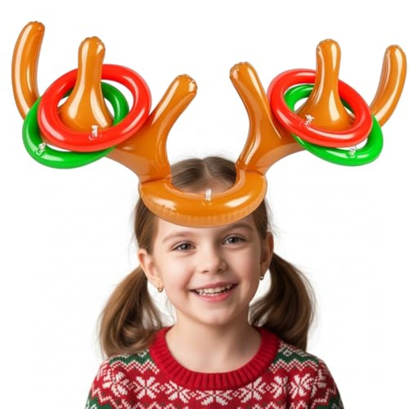 - Includes adjustable inflatable reindeer antler headband and 4 rings (2 red, 2 green)