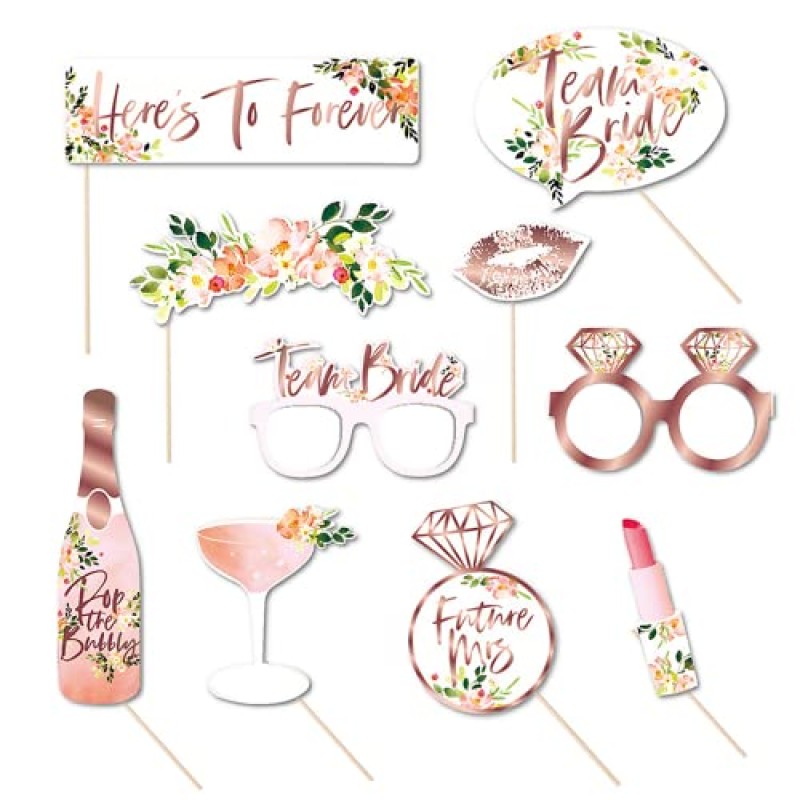 - Includes 10 themed photo booth props with varied bridal designs