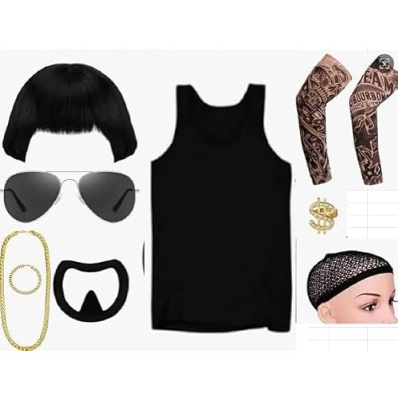 - Includes 9 pieces: vest, bowl cut wig, goatee, sunglasses, gold chain, tattoo sleeve, headband, bracelet, and ring