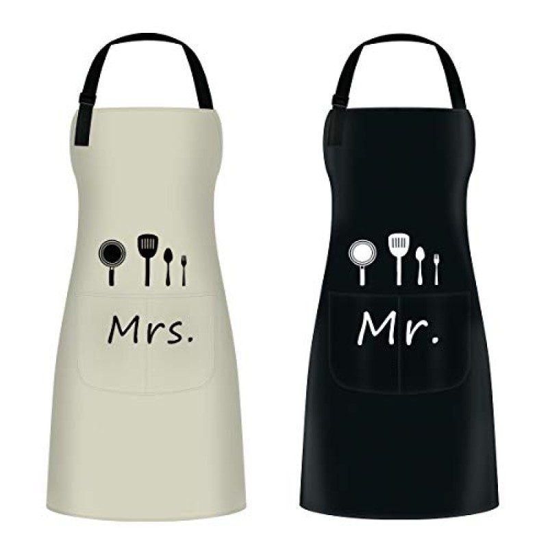 - Set includes two aprons: one 'Mr' and one 'Mrs' in classic black and white