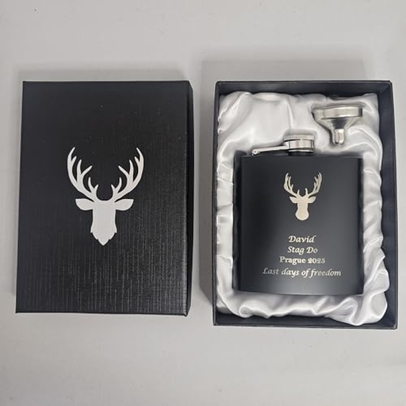 This sleek 6oz black stainless steel hip flask is a cracking addition to any stag do, boasting a classy engraved deer antler design paired with your own customised text. Personalisation is laser etched for durability, so your chosen names, dates, or cheeky messages won’t fade or rub off, making it a keepsake as well as a practical party essential. Whether you’re raising a toast mid-adventure or kicking back after a day’s escapade, this flask is designed to slip easily into your pocket or stag bag, keeping spirits high and the laughs rolling.