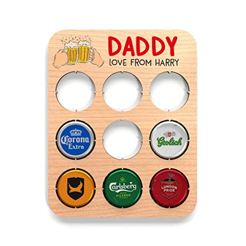 Gather your favourite beer bottle caps in style with this personalised wooden beer cap collector coaster. Crafted from 4mm thick cherry wood, its warm, rustic tones and natural wood grain bring a welcoming charm to any man cave or home bar. The coaster is laser-cut to hold up to nine standard bottle caps, making it a brilliant way to showcase your top brews and the stories behind them.