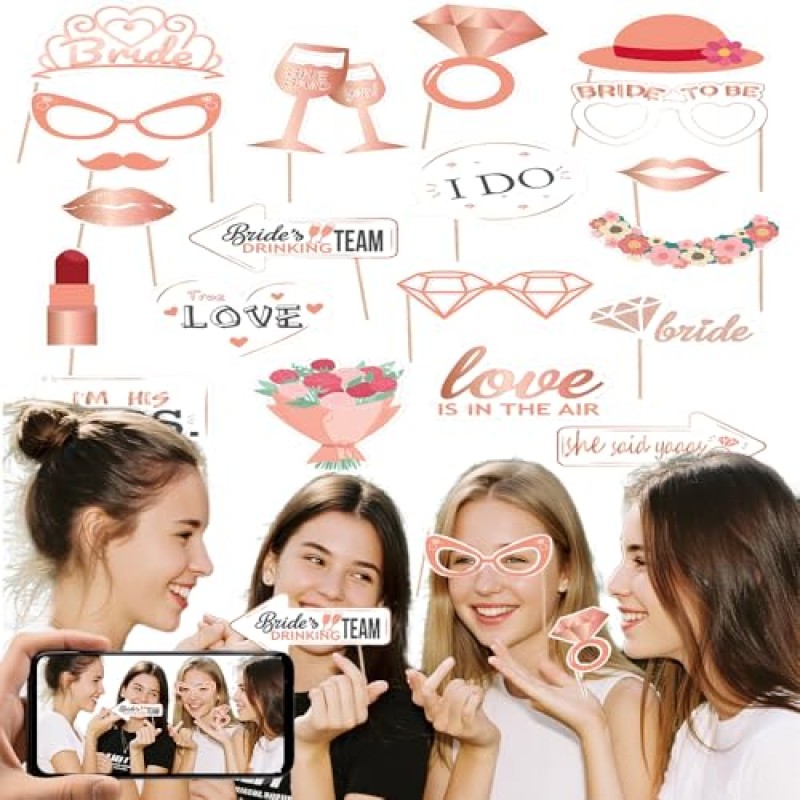 - Includes 20 varied rose gold prop designs featuring glasses, lips, flowers, rings, and signs
