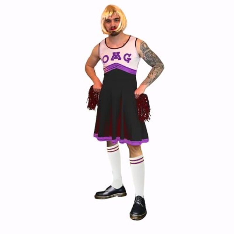 Get ready to steal the show with this hilarious men’s cheerleader stag costume, designed to bring belly laughs and lively spirit to any stag do. Featuring a bold “OMG” print across the chest and complete with two matching pom poms, it’s perfect for making a memorable entrance or leading the gang on an unforgettable pub crawl. Crafted from soft, lightweight polyester, the slip-on dress offers comfort and freedom to jump, dance, and cheer all night long with no fuss.