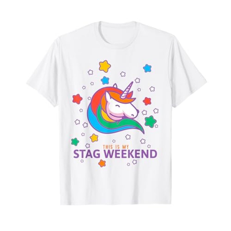 - Features "This is my stag weekend" slogan with a cute sleeping unicorn and stars