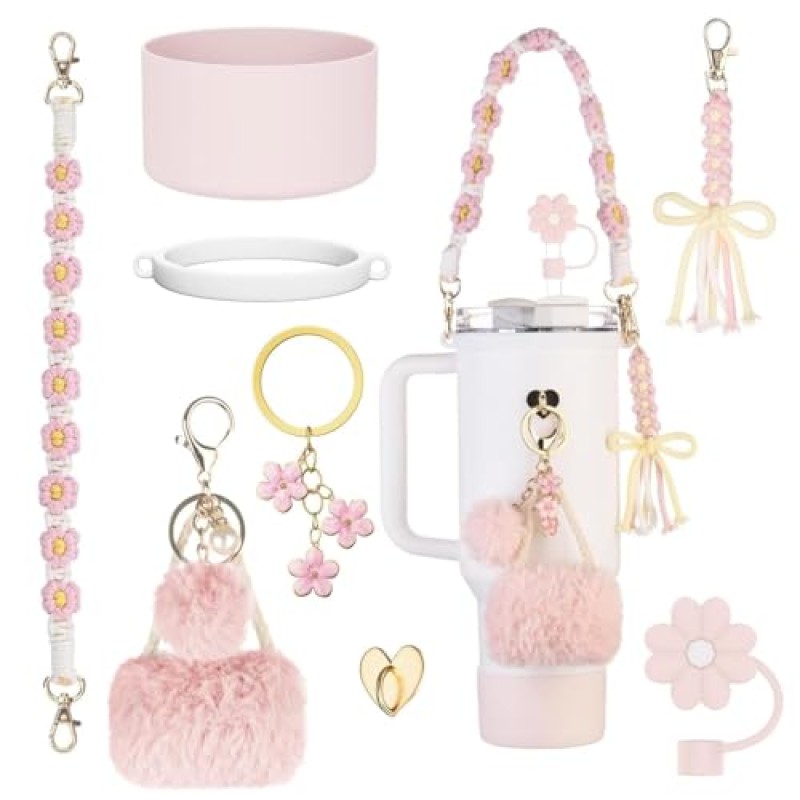 - Includes 8 colourful accessories: woven strap, silicone straw cover, elastic lid ring, heart-shaped base, plush pendant, flower keychain, knitted bow, and boot