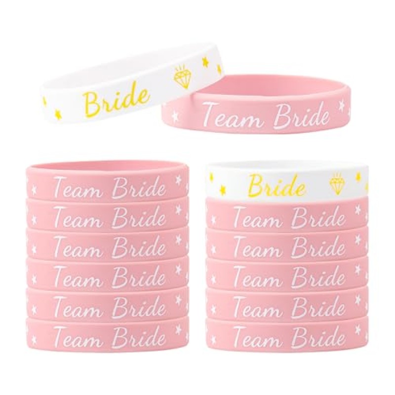 - Pack of 12 wristbands: 1 'The Bride' + 11 'Team Bride'