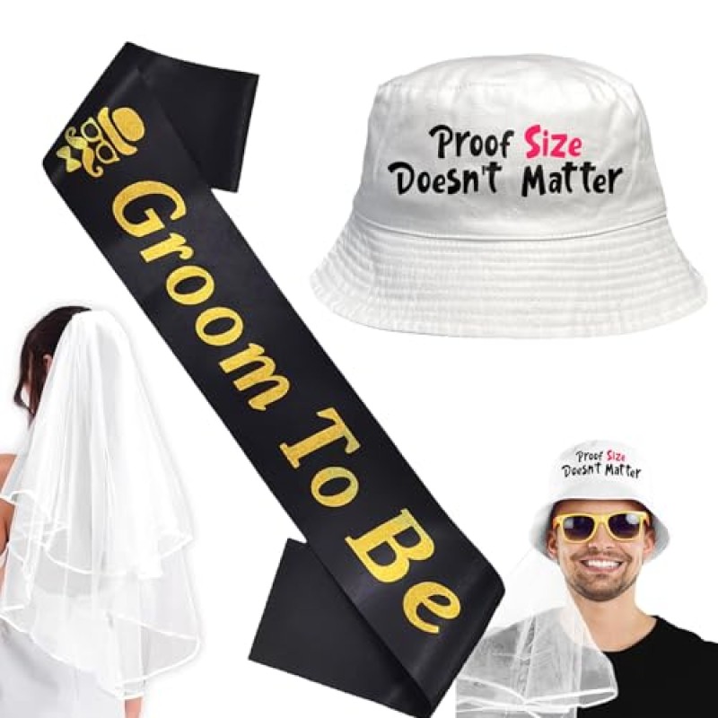 - Includes white stag do hat (58cm/22.8"), white bride veil (80cm/31.5"), and black sash (80cm/31.5")