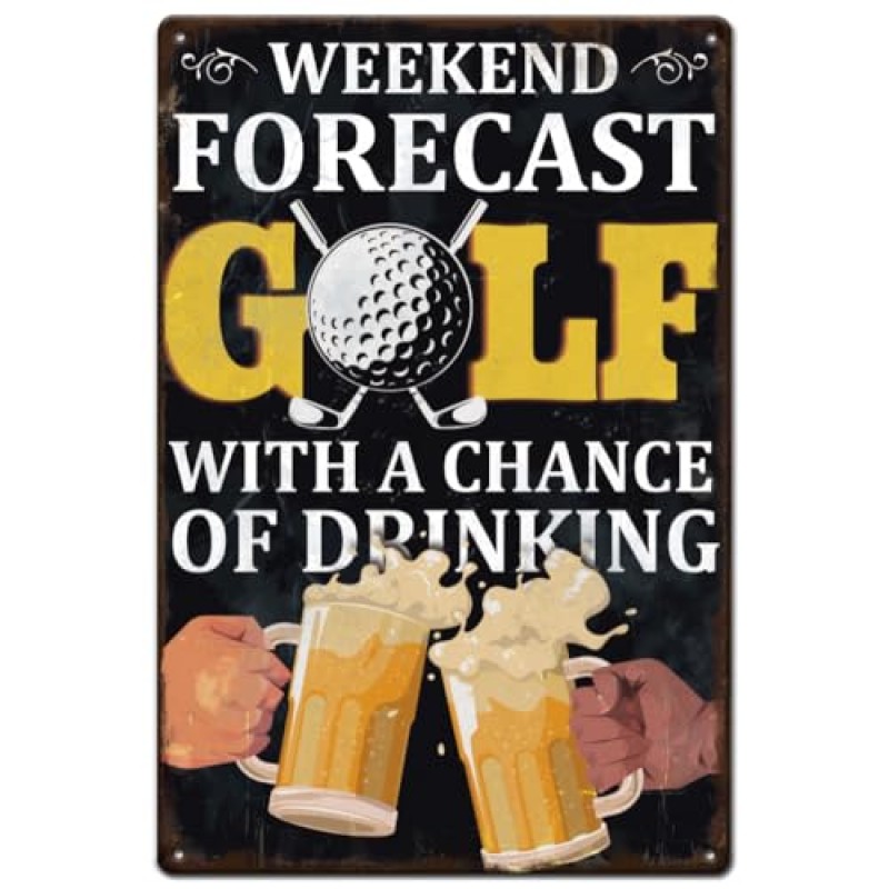 Bring a cheeky touch of vintage charm to your stag do venue with this classic metal tin sign featuring the hilarious quote 'Weekend forecast golf with a chance of drinking'. Measuring a handy 8x12 inches, it's the perfect wall plaque to set the mood in a man cave, pub, or playroom. Crafted from durable iron, this sign promises to withstand the boisterous energy a stag party brings, while its nostalgic golf and beer design adds a dash of playful personality. Ready to hang straight out of the box with pre-drilled corners, it’s an effortless way to inject some fun and flair into your celebration space. Whether you mount it indoors or bring it along to an outdoor meet-up, this sign helps keep the group's spirits high and the laughs rolling.