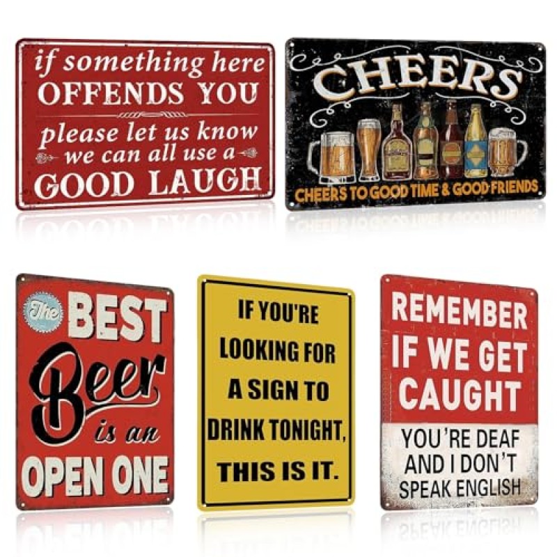 Add instant character to your stag do venue with this 5-piece vintage metal bar sign set, perfect for decking out your man cave, home bar, or garden pub. Each sign measures a generous 8x12 inches, boasting bold retro graphics that bring a splash of cheeky charm and authentic pub vibes to any space. Crafted from durable, rust-proof tinplate, these signs are built to withstand indoor parties and outdoor antics alike, so no need to worry about a few pints spilled or the odd weather change.