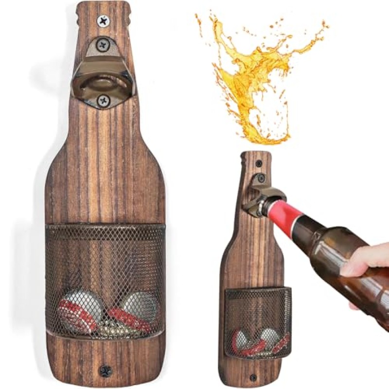 Keep the drinks flowing effortlessly during your stag do with this vintage-style wooden bottle opener that mounts neatly on any wall. Crafted from high-quality poplar wood and zinc alloy, it’s both sturdy and stylish, blending well with any home bar, kitchen, or garden setting. The clever mesh cap catcher swoops in like a tidy sidekick, collecting bottle caps so your space stays clutter-free even when the squad is letting loose. Installation is a doddle—grab the included screws, pop it on your fence post, bar wall, or kitchen, and get popping bottles with just one hand, freeing the other for high-fives and cheers. It’s a practical, space-saving addition that doubles as a retro decor piece, adding a touch of character and convenience to your gathering spot. Ideal for backyard BBQs, laid-back sessions, or lively celebratory nights, this opener is a reliable crowd-pleaser that keeps things flowing smoothly.