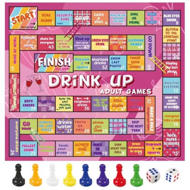Perfectly sized at 37 x 42 cm, the waterproof mat is built tough to withstand spills and repeated use, making it hassle-free for rowdy rounds. The game includes a mat, eight colourful player tokens, and two dice, providing all you need for a group ready for laughs and a few cheeky drinks. Lightweight and compact, it stores easily and fits neatly into any party setup.
