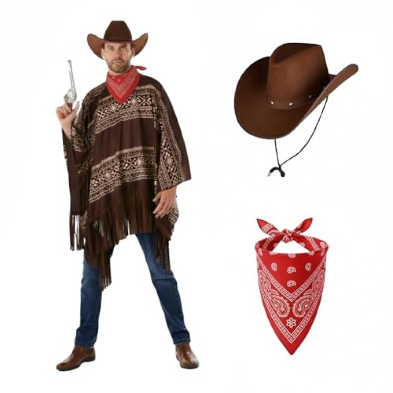 - Includes poncho, wide-brimmed cowboy hat & red bandana